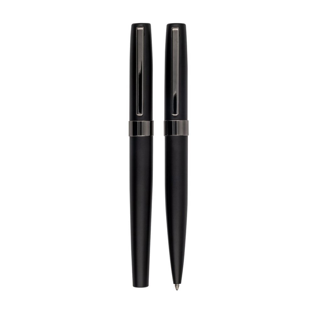 Erleben Sie mit unserem hochwertigen Kugelschreiber Schreibset den idealen Imageträger für Ihre Marke! Mit eleganten metallischen Akzenten und einer anspruchsvollen schwarzen Geschenkbox bringt jedes Set Klasse und Professionalität in die Hände Ihrer Kunden. Das Set enthält einen Drehkugelschreiber und einen Rollerball, beide ergonomisch gestaltet für ein unvergleichliches Schreibgefühl.