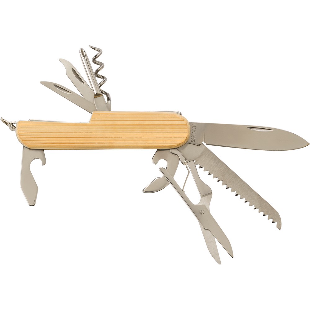 Erleben Sie mit unserem multifunktionalen Taschenmesser den idealen Imageträger für Ihre Marke. Mit seinen 9 Funktionen und dem Zusammenspiel aus langlebigem Bambus und robustem Metall bietet dieses Werkzeug nicht nur praktischen Nutzen, sondern wird auch zum täglichen Begleiter Ihrer Kunden. Durch individuelle Lasergravuren oder Tampondruck bleibt Ihr Logo stets im Fokus und sorgt für eine langfristige Präsenz Ihrer Unternehmensidentität.