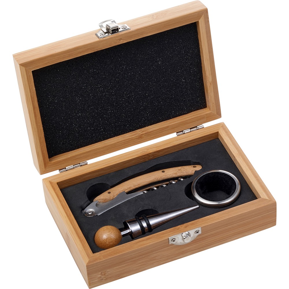Entdecken Sie das exklusive Weinset in einer stilvollen Bambusbox – Ihr idealer Werbeartikel, um markanten Eindruck zu hinterlassen. Mit seinen eleganten Edelstahl-Akzenten vereint dieses Set funktionale Weinaccessoires: einen Korkenzieher, einen Weingussring und einen Flaschenverschluss. Die hochwertige Verarbeitung aus nachhaltigem Bambus sorgt für eine positive Wahrnehmung Ihrer Marke, während die edlen Materialien die Wertigkeit unterstreichen.