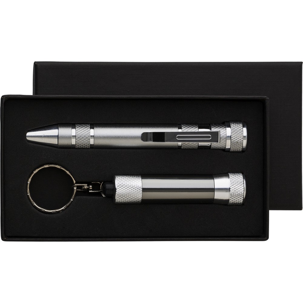 Entdecken Sie das perfekte Werkzeugset mit Taschenlampe – der ideale Werbeartikel, der Ihre Marke mit Stil repräsentiert. Dieses kompakte Set, bestehend aus einem Stift-förmigen Schraubendreher mit 8 Bits und einer kompakten Taschenlampe mit 3 LED-Lichtern, bietet nicht nur praktische Lösungen für den Alltag, sondern verstärkt auch die Sichtbarkeit Ihrer Marke. Die hochwertige Lasergravur oder der präzise Tampondruck ermöglichen eine langlebige und ansprechende Platzierung Ihres Logos.